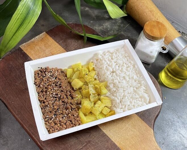 Patinho moído funcional, abobrinha refogada e arroz branco